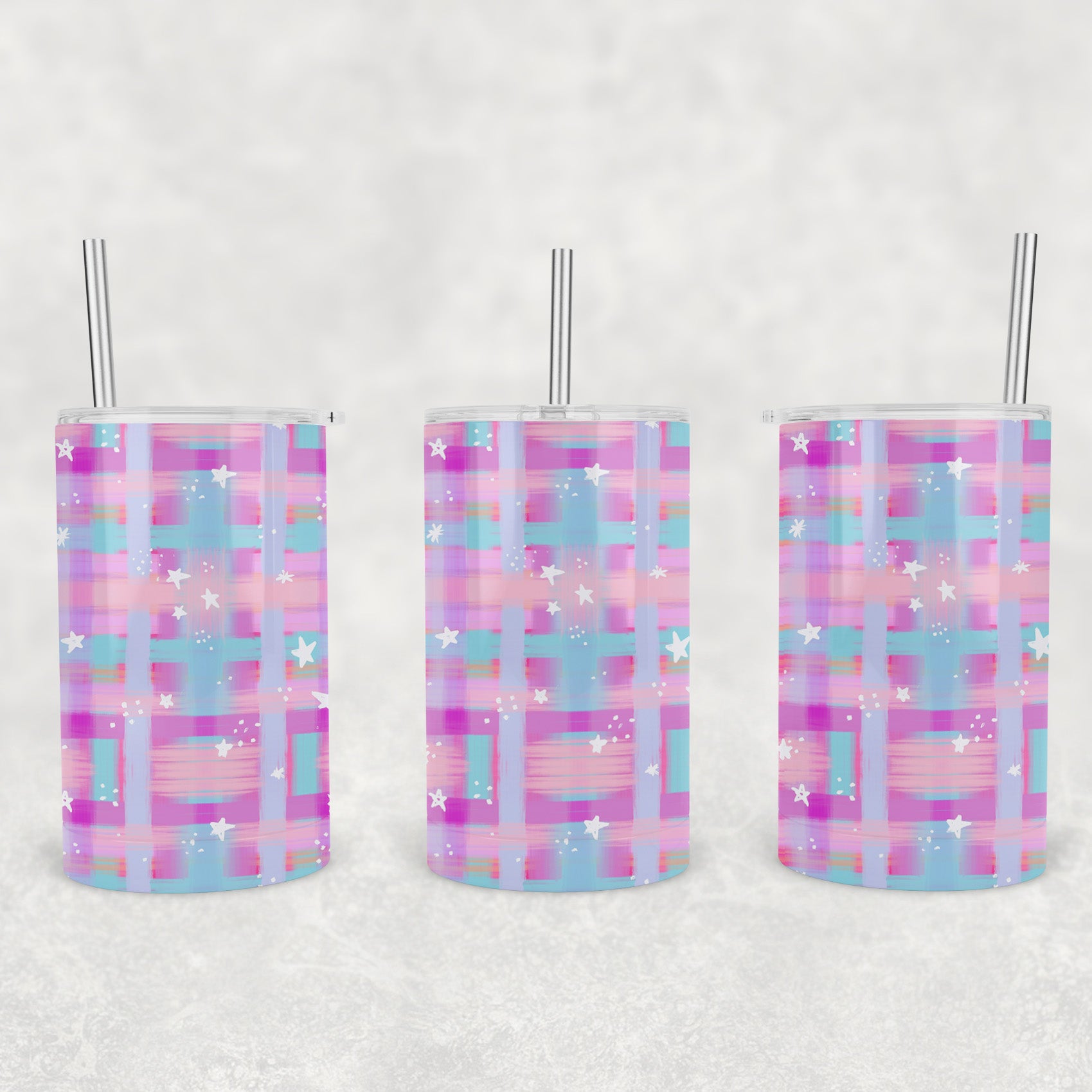 12 oz Kids Skinny Tumbler, Purple Painted Plaid With Stars