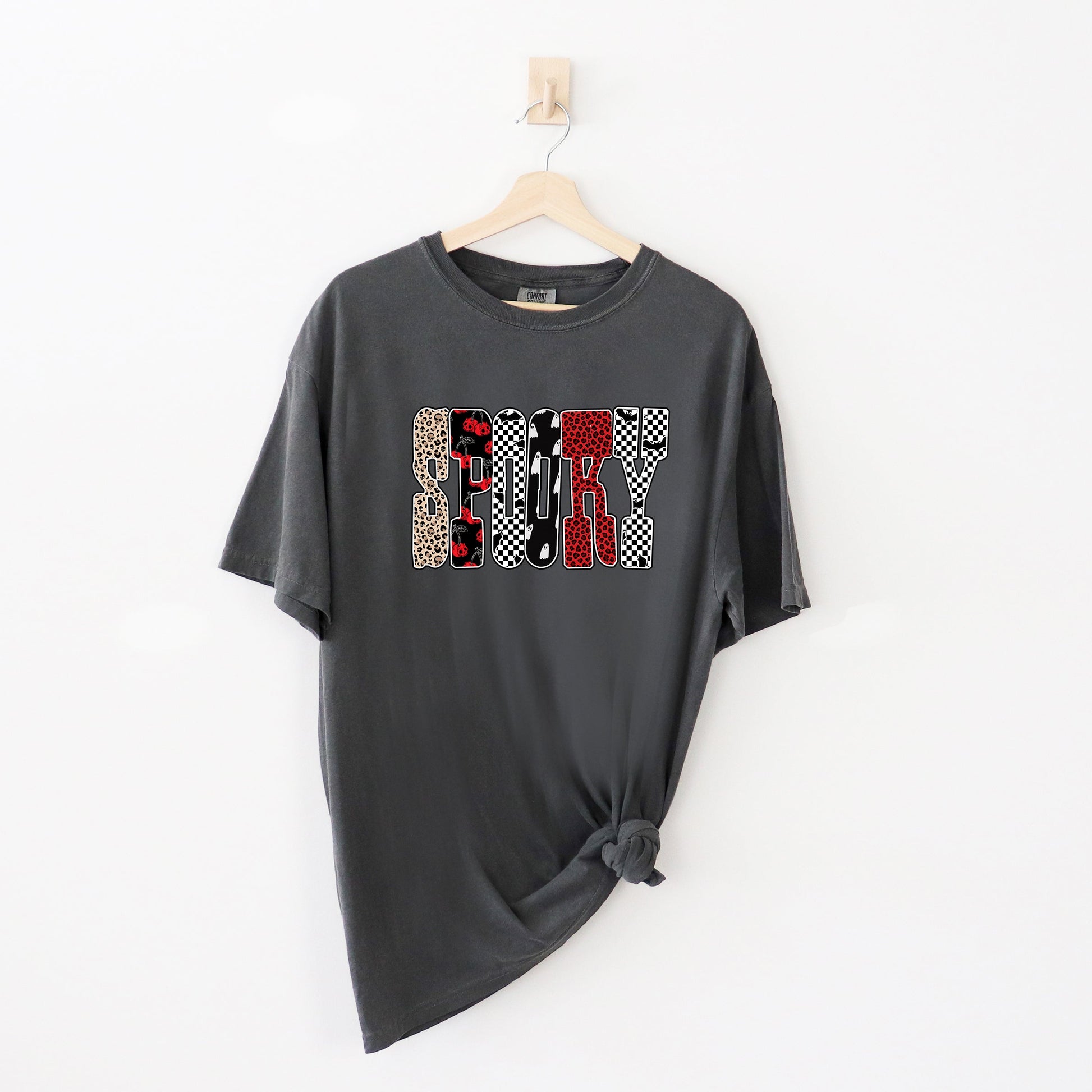 This Comfort Colors tee is made from 100% cotton in a pepper color. It features a front graphic with the word "Spooky" decorated in Halloween patterns. Comfortable and perfect for celebrating the Halloween season.