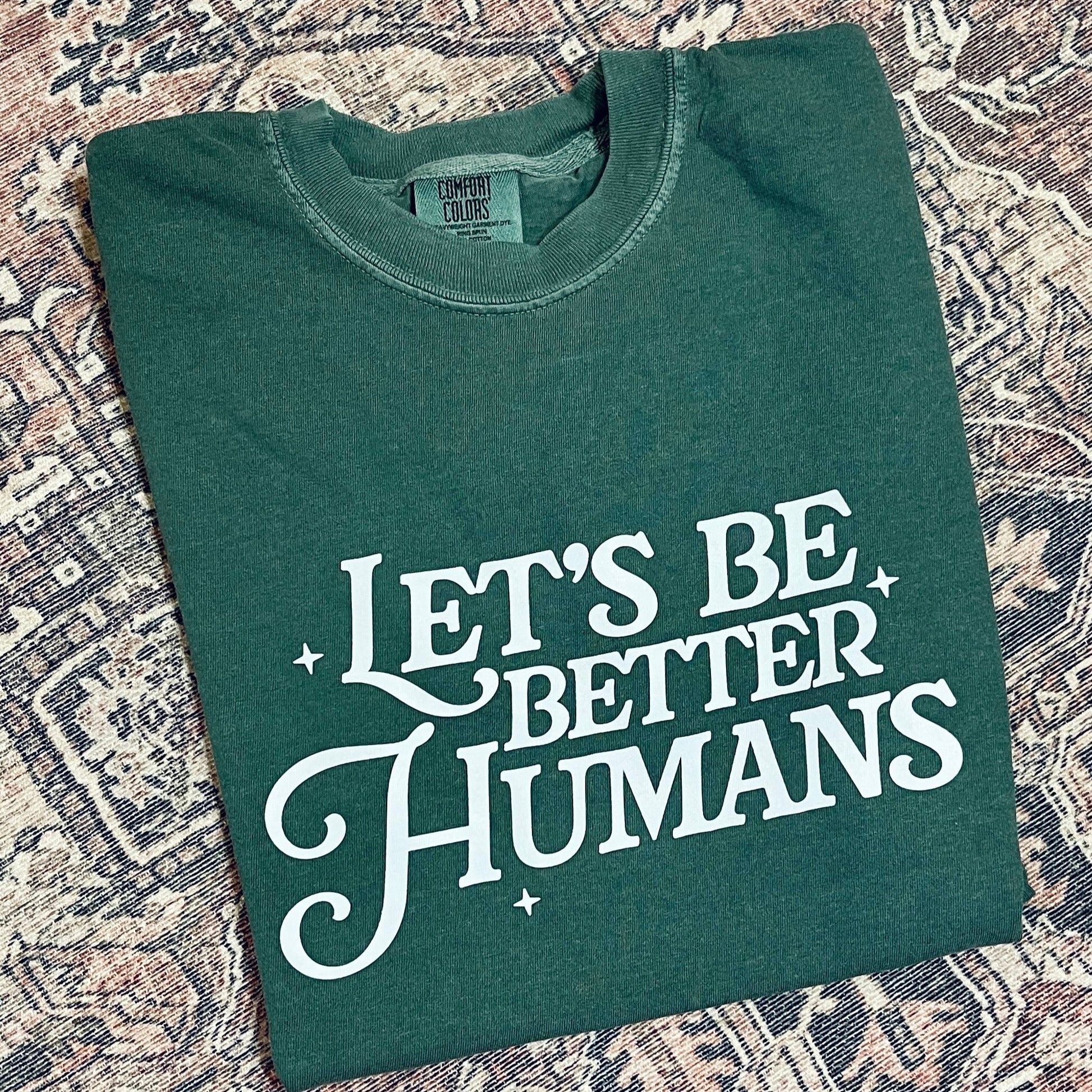 The Let's Be Better Humans Tee is designed with comfort in mind, made with 100% cotton from the trusted Comfort Colors brand. Featuring a calming blue spruce color and a powerful graphic on the front, this unisex tee is a perfect way to spread a message of positivity and growth.